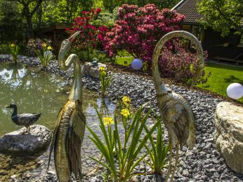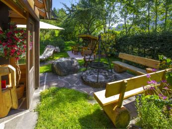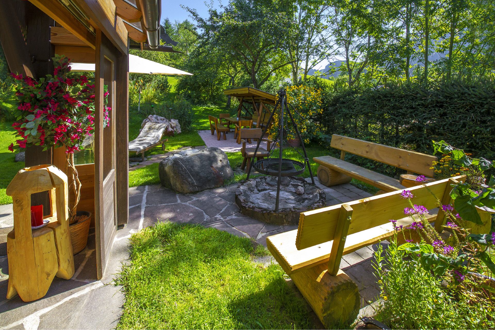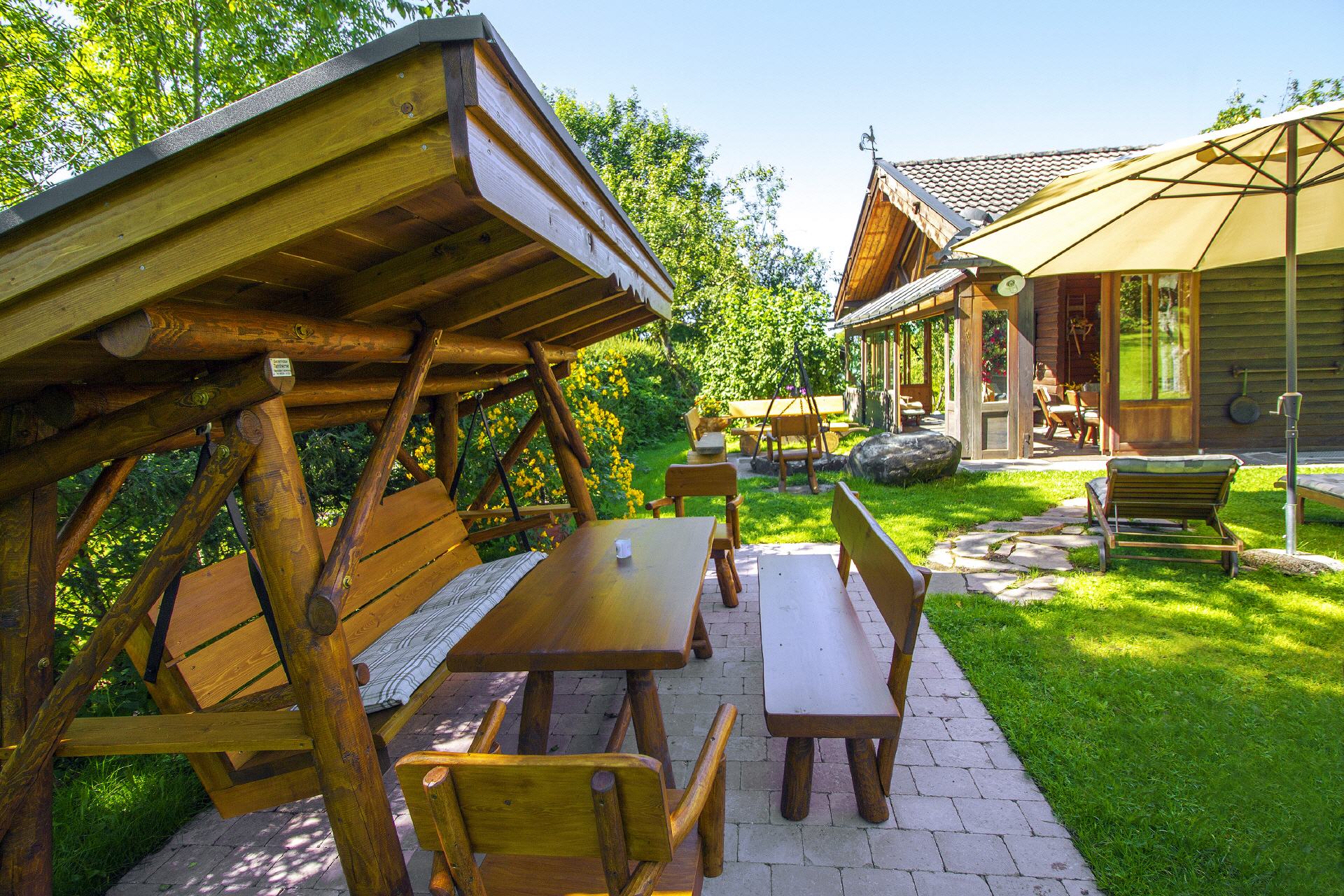 • großer Garten, rustikale Gartenmöbel, Liegen, Sonnenschirme und Grill